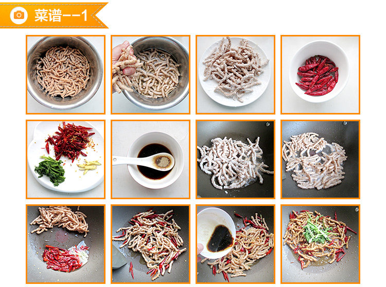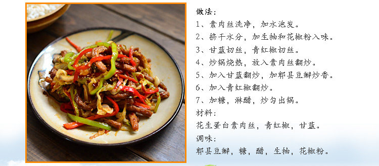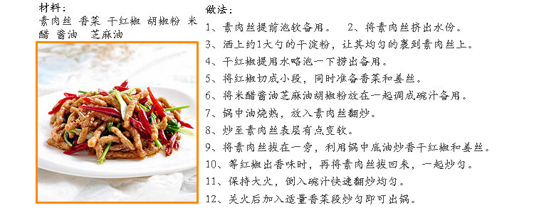 | 做法: | 1、素肉丝用温水二三分钟 |