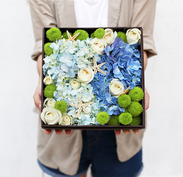 鲜花花盒由我们精选当季花材,经花艺师原创设计和手工制成。