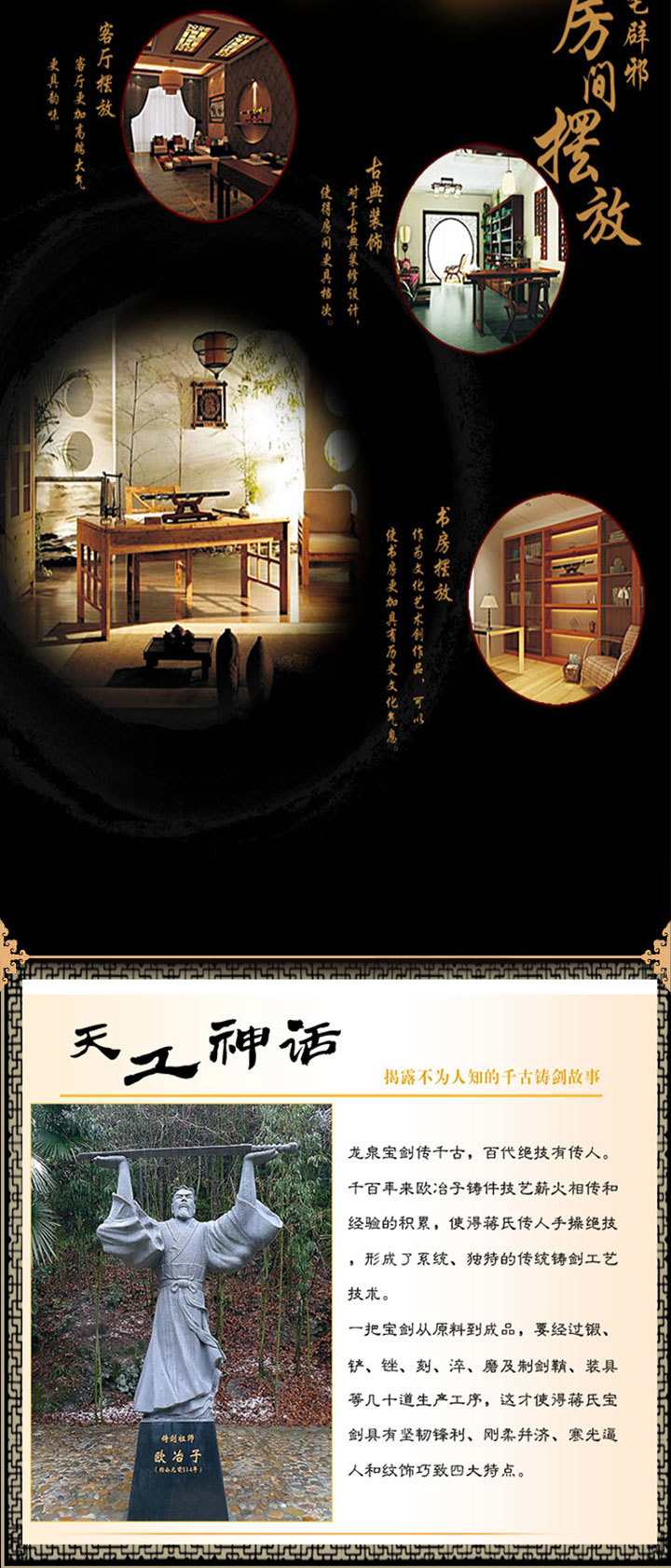 浙江蒋氏刀剑有限公司坐落在风光优美的中国宝剑之都龙泉市,是生产刀、剑及武术器械的专业性企业,是龙泉市刀剑行业的重点龙头企业。