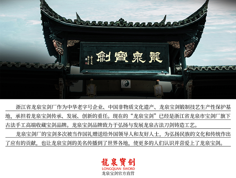 传承千年铸剑工艺,弘扬龙泉宝剑文化,我们是龙泉宝剑厂有赞官方旗舰店。