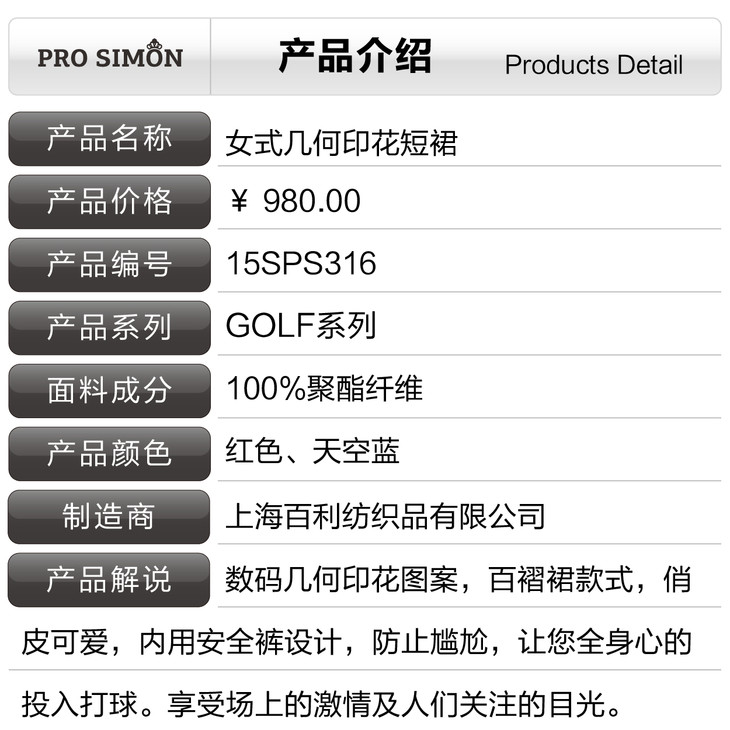 - PROSIMON高尔夫服饰,旗下有高尔夫运动系列、好动衬衫系列、色彩选制系列丰富的商品线。
