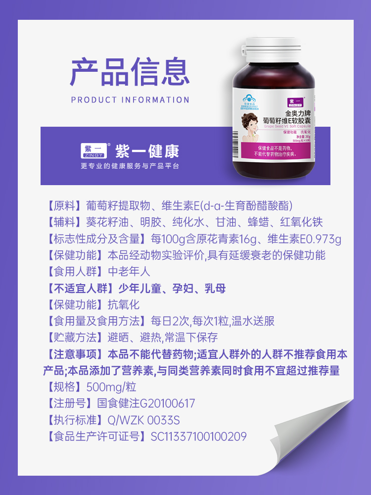 【呵护皮肤,双重抗氧化】紫一葡萄籽维E软胶囊 60粒/瓶