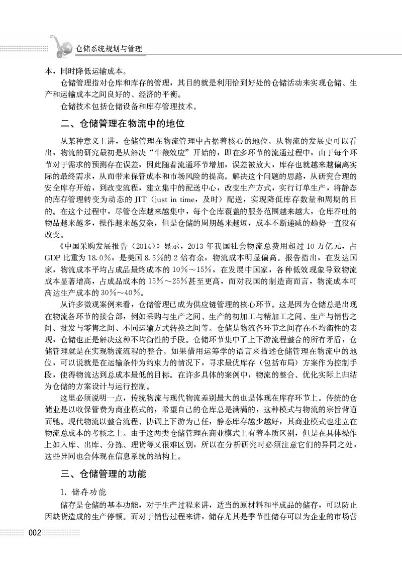 2.仓储系统分析。物流本身是个大系统,系统分析是物流管理过程中重要的分析方法。本部分介绍了系统的含义、特点、物流系统的内涵,接着介绍了仓储系统的构成要素,最后介绍了自动仓储系统的发展、优点、类型,以及自动化立体仓库的设计与规划过程。