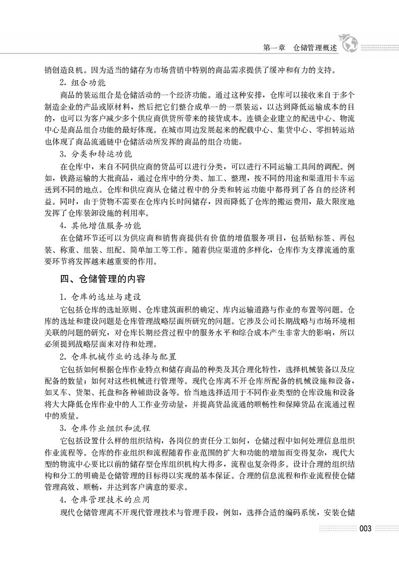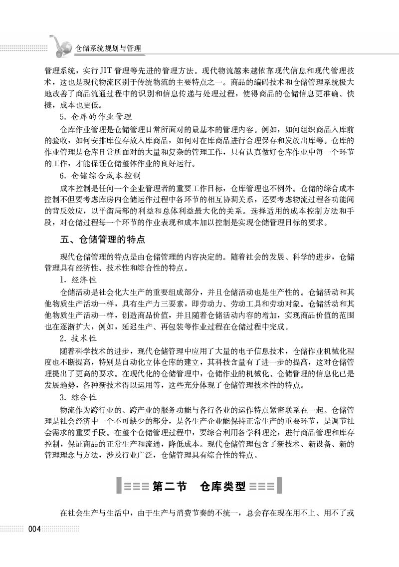 3.仓储系统规划。本部分首先介绍了仓储系统规划的原则和规划一般步骤。接着介绍了仓库选址的因素、方法、然后阐述了仓库平面规划和立体规划的内容,探讨了厂(库)区布置的方法,最后介绍了储位规划、仓库设备配置和人员组织结构的形式等内容。