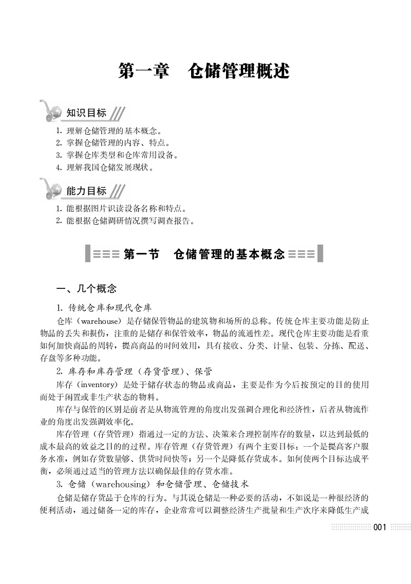1.仓储管理概述。首先对仓储管理中的几个名词,如仓储、仓库、仓储技术、仓储管理、库存、库存管理等含义进行辨析,然后对仓库的类型和特点进行了描述,接着对仓储管理中常用的设备进行分类阐述,最后对我国仓储管理的发展阶段和现状进行简要阐述。