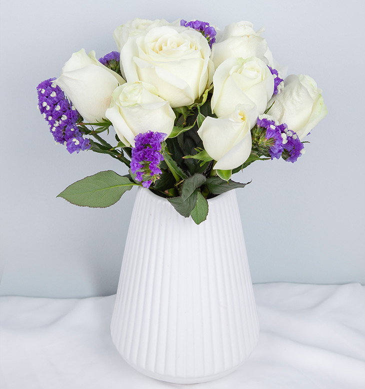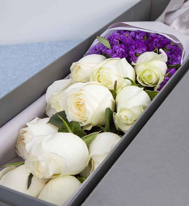高档礼盒装鲜花:白玫瑰11枝,勿忘我适量
