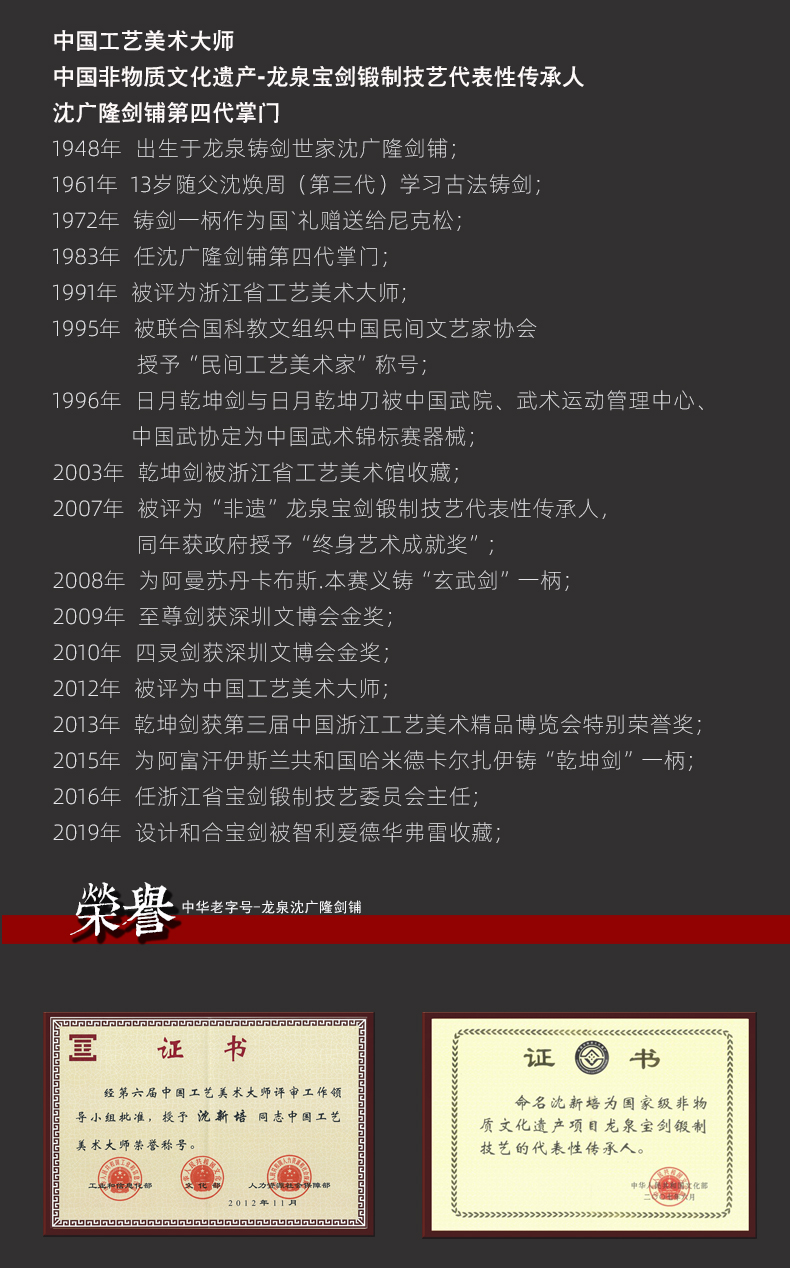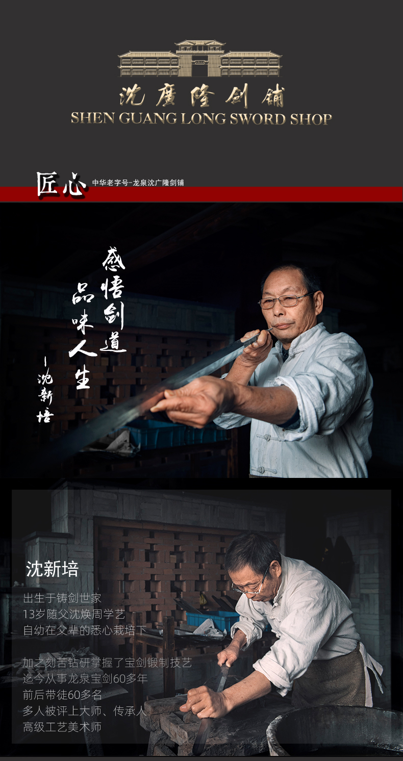 - 龙泉沈广隆剑舖创始于1885年(清光绪)位于浙江省龙泉市,是当地唯一一家“子承父业”一脉相承的中华老字号宝剑生产企业,是国家级非物质文化遗产龙泉宝剑项目保护单位,并以“天下第一剑”闻名于海内外....