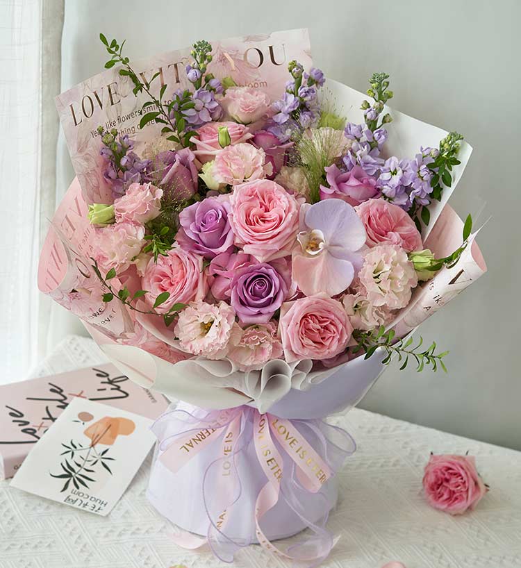 紫色玫瑰5枝,粉色荔枝玫瑰5枝,粉色绣球1枝,粉色卷边洋桔梗5枝(3头/枝),紫色紫罗兰5枝,白色蝴蝶兰喷粉色加紫色1朵,喷泉草2枝,雪柳叶5枝