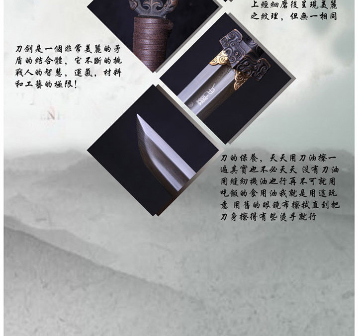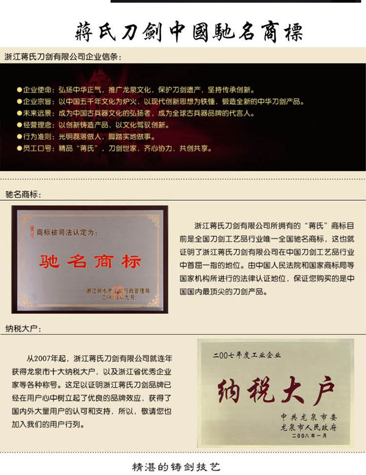 浙江蒋氏刀剑有限公司坐落在风光优美的中国宝剑之都龙泉市,是生产刀、剑及武术器械的专业性企业,是龙泉市刀剑行业的重点龙头企业。