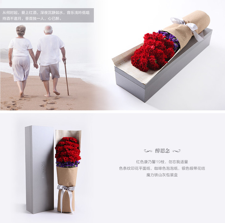 材料:19支红色康乃馨,紫色勿忘我搭配。