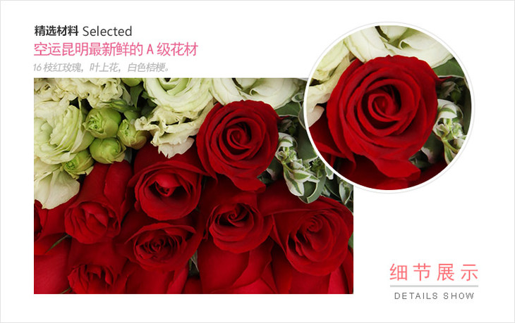 | 材 料: | 16枝红玫瑰,叶上花,白色桔梗。 |