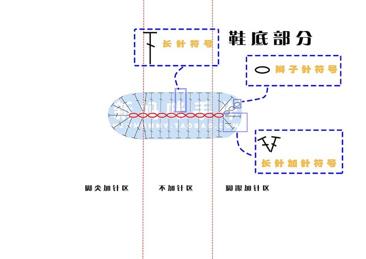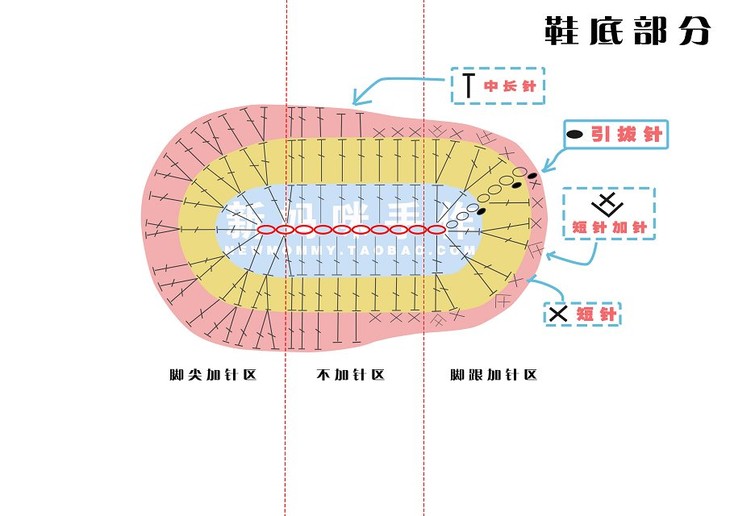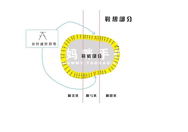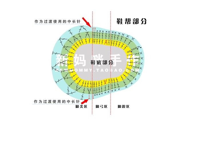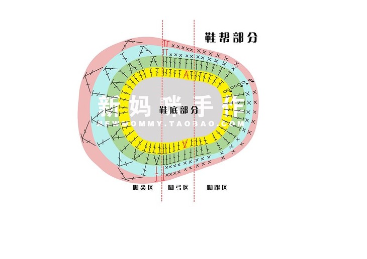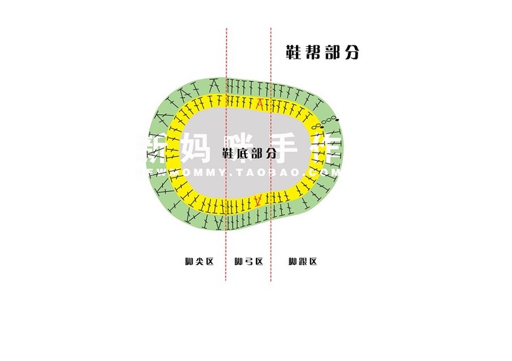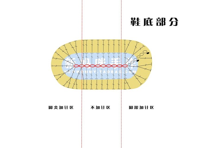 钩好鞋底后,我们来学习钩鞋帮。鞋帮仍然为钩圈的方法,这款鞋帮为4圈结构。根据鞋帮的钩编方法,仍然把鞋帮分为3个区域,分别是脚尖区、脚弓区,脚跟区。下面我们分步讲解。