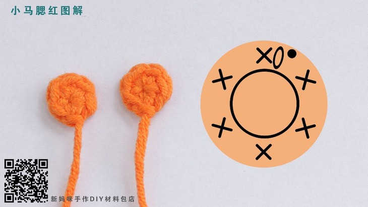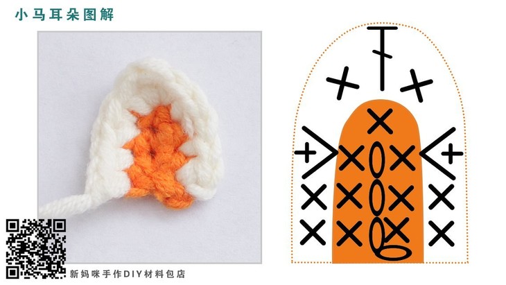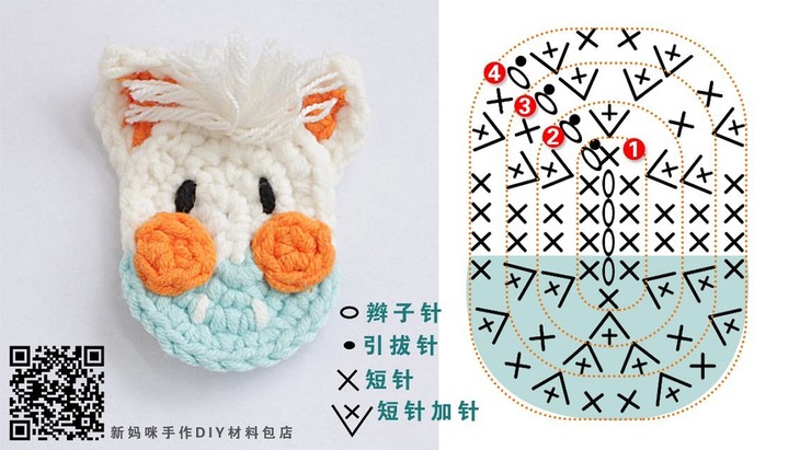 马脸部分用到的针法有:辫子针、引拔针、短针和短针加针,这里我们已经分别做了标记。马脸的这个椭圆是由4圈的短针和短针加针组成,编织的顺序是从中心开始逆时针环状向外编织,脸部又分为上下两色,因此我们编织中需要用到换线的编织方法,建议大家在钩的时候可以对照我们的图解。