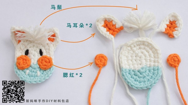 马脸是由四部分来完成,即脸部,耳朵,腮红和马鬃。我们分别钩好这四部分,然后再将他们缝合到一起,就组成了小马的脸部。