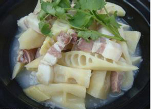 含午餐:咸肉烧笋+红烧肉+炒螺丝+红烧鲫鱼+野菜+汤