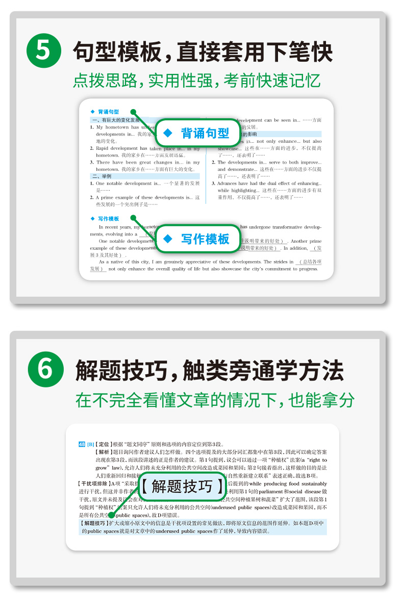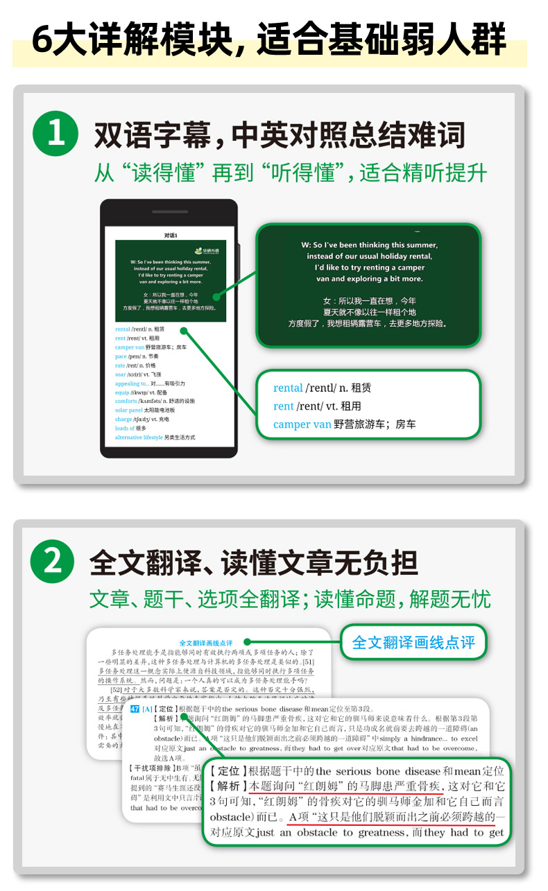 2. 解析6大详解模块,适合基础薄弱者使用:听力双语字幕、阅读全文翻译、词汇总结、写作翻译无生词、句型模板、解题技巧;