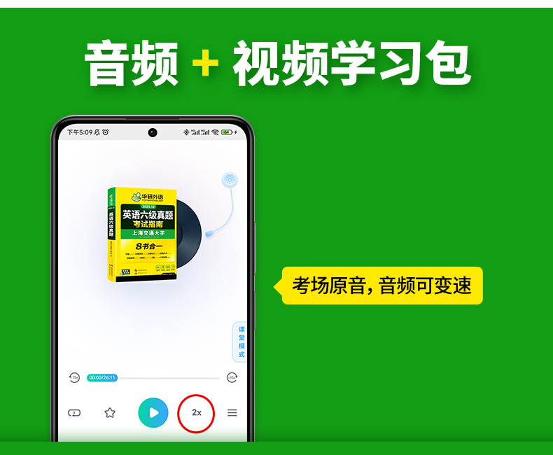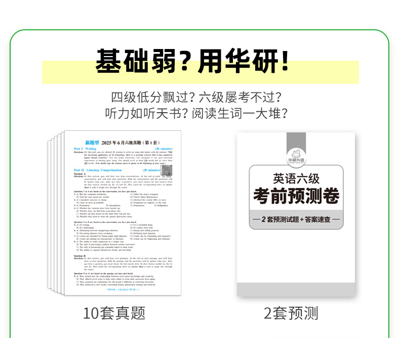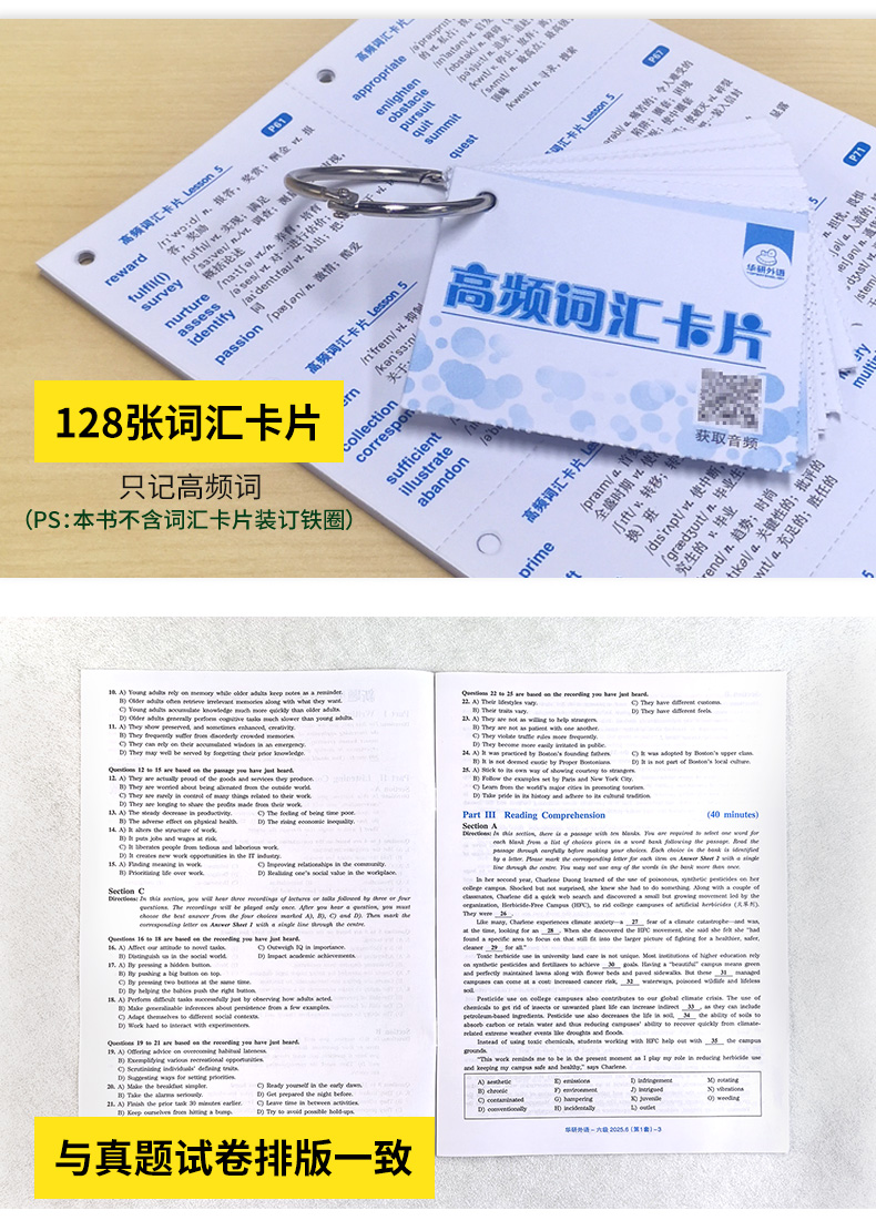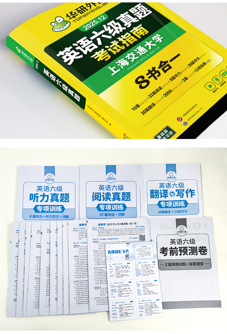 音频:英语六级真题试卷、考前预测卷、词汇卡片、六级口语样卷、听力真题专项训练训练分册(内文相应页码扫码获取)