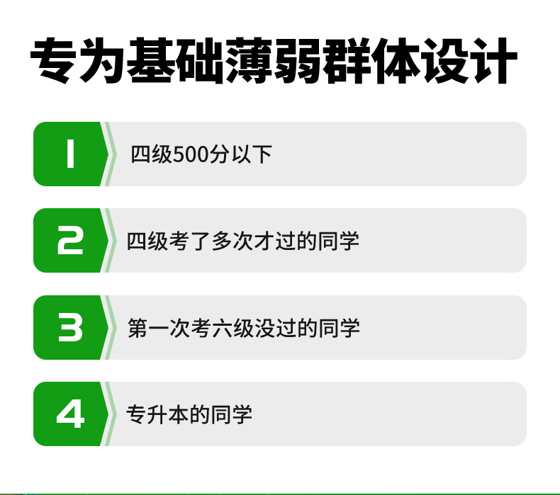 英语基础薄弱的考生;英语四级考多次才通过、首次考六级的学生;英语四级500分以下的考生;做真题有较多生词的考生;备考时间较短,需要一本书就过级的考生;需要全面复习六级所有题型的考生;希望通过自学通过考试的考生。
