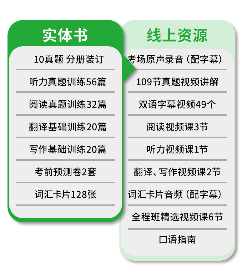 9. 阅读解题技巧视频课3节(阅读真题专项训练内文扫码获取);听力解题策略视频课1节(听力真题专项训练内文扫码获取);翻译、写作技巧视频课2节(翻译与写作基础训练内文扫码获取);