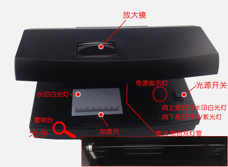 产品介绍:台式多功能紫光鉴别仪(10W大功率,U型灯管、LED白光、放大镜、带刻度)有线插电式。