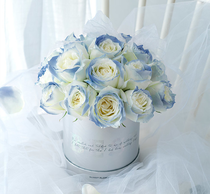材料 19枝碎冰蓝玫瑰抱抱桶(坦尼克白玫瑰,使用密西根碎冰蓝边缘喷淡蓝色工艺处理)