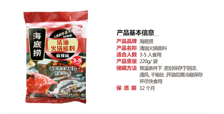 海底捞 火锅底料 220g(清油麻辣味)