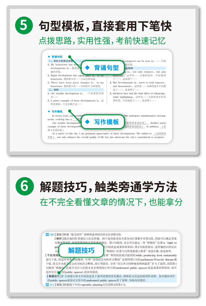 2. 解析6大详解模块,适合基础薄弱者使用:听力双语字幕、阅读全文翻译、词汇总结、写作翻译无生词、句型模板、解题技巧;