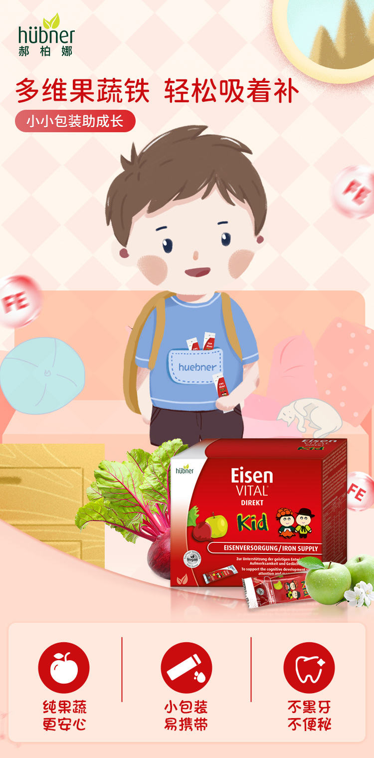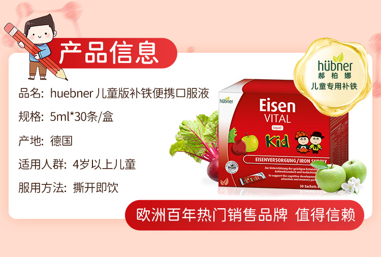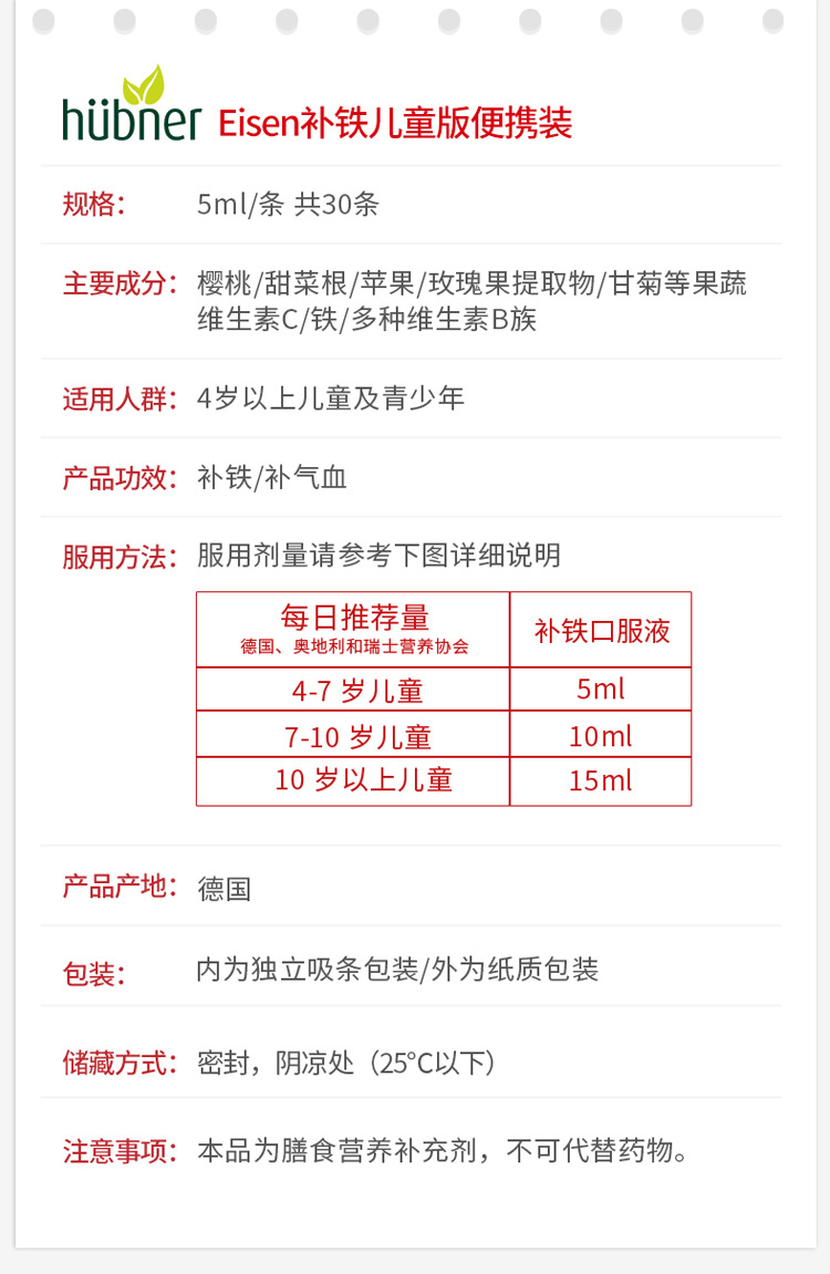 【香港直邮】德国Huebner郝柏娜儿童铁元素补铁口服液吸条便携装5ML*30条/盒