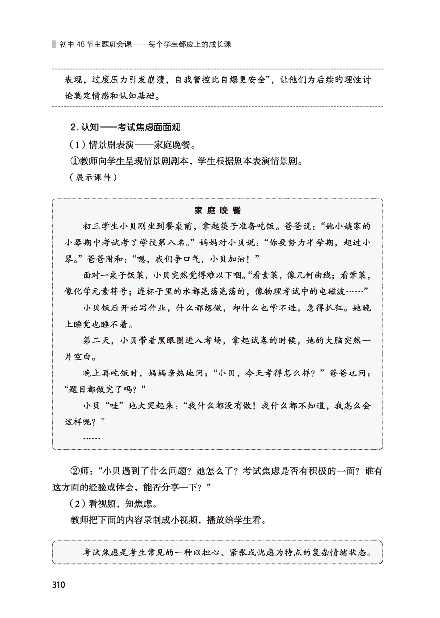 (3)丰富资源赋予效度:本书中的48节班会课涵盖团队协作、自主管理、劳动素养、文化传承、生涯规划、挫折教育等多项关键学生成长议题,另有30余张示例图直观呈现教学细节,扫码可见配套课件,助力一线班主任轻松落地优质课堂。
