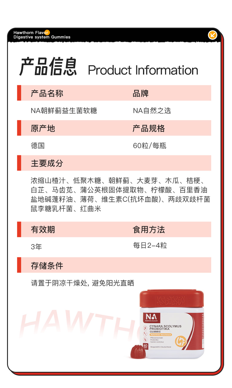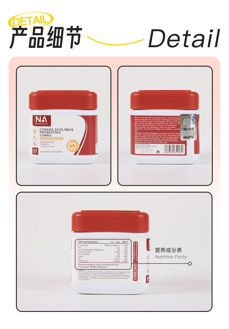 【品名】德国NA自然之选 朝鲜蓟益生菌软糖 【规格】60粒/瓶 【产地】德国 【保质期】3年 【发货包装】独立包装瓶 【发货地】浙江 【发货快递】圆通,中通,申通,邮政,韵达等随机发 【不发货区域】新疆,西藏,港澳台 【发货时效】48-72小时,周末节假日顺延 |