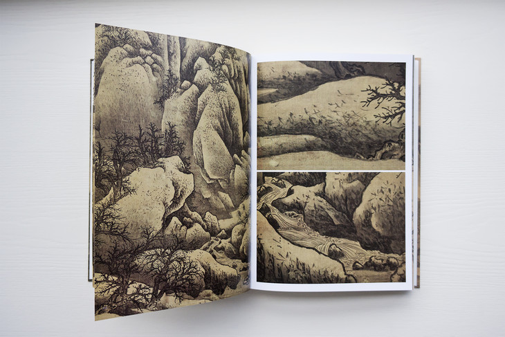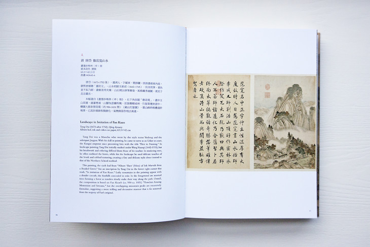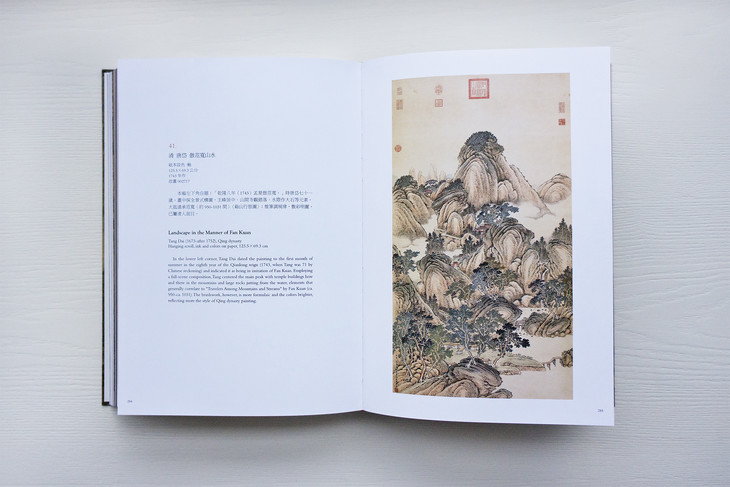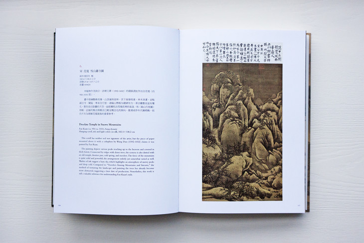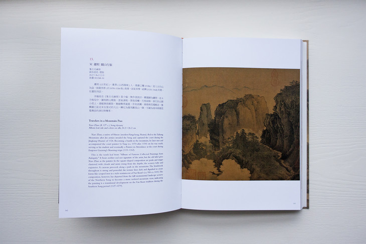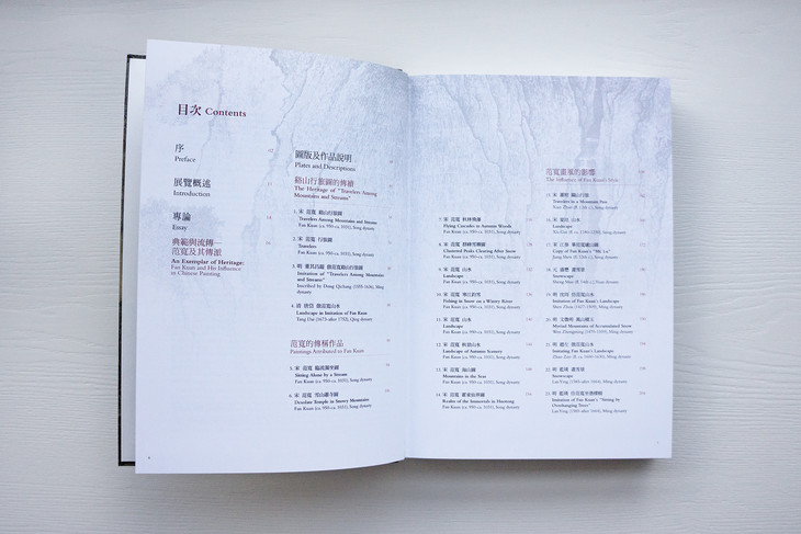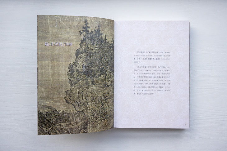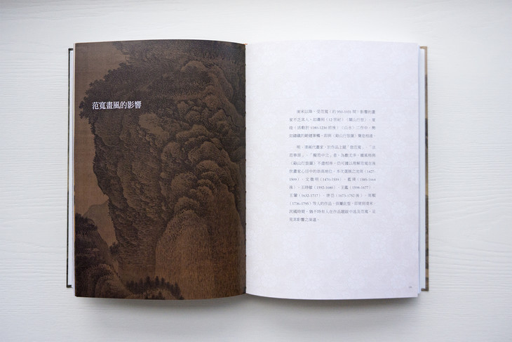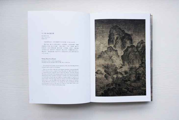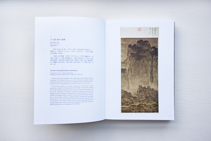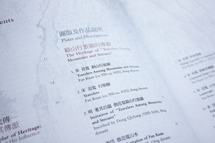 图录共收入四十五件画作,依作品性质,可划分为“溪山行旅图的传续”、“范宽的传承作品”、“范宽画风的影响”三类。包括范宽《溪山行旅图》《行旅图》《临流独坐图》等名作在内,亦系统地展示继范宽之后,历代画家的同名摹作,以及学习范宽“雨点皴”、“矾头密林”等技法的作品,援以梳理范宽风格的传续脉络。