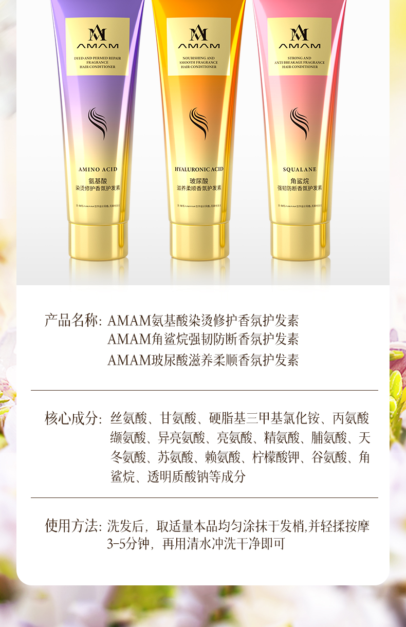 【品名】【超值3支装】AMAM香氛护发素组合 清爽柔顺 水润光泽 200ml*3支 【规格】 氨基酸护发素200ml*1 玻尿酸护发素200ml*1 角鲨烷护发素200ml*1 【许可证编号】粤妆20161240 【执行标准】QB/T 1975 【产地】国内 【保质期】3年 【发货包装】独立包装 【发货地】广州 【发货快递】中通、圆通、申通、韵达随机发 【不发货区域】新疆、西藏、港澳台 【发货时效】48-72小时,周末节假日顺延 |