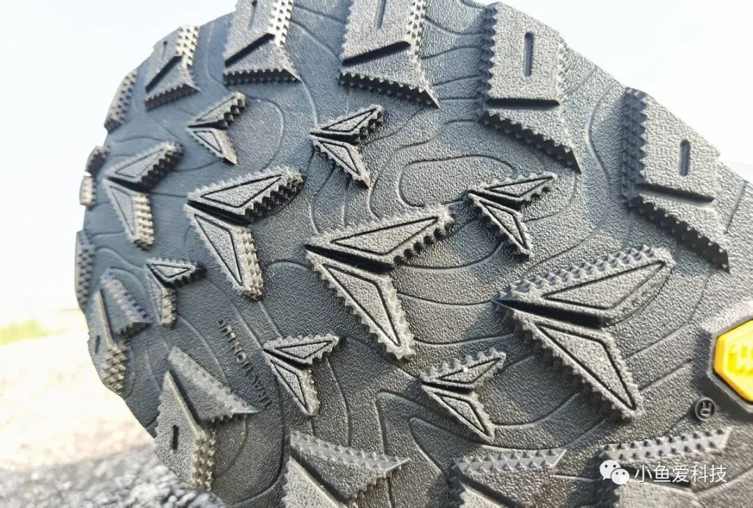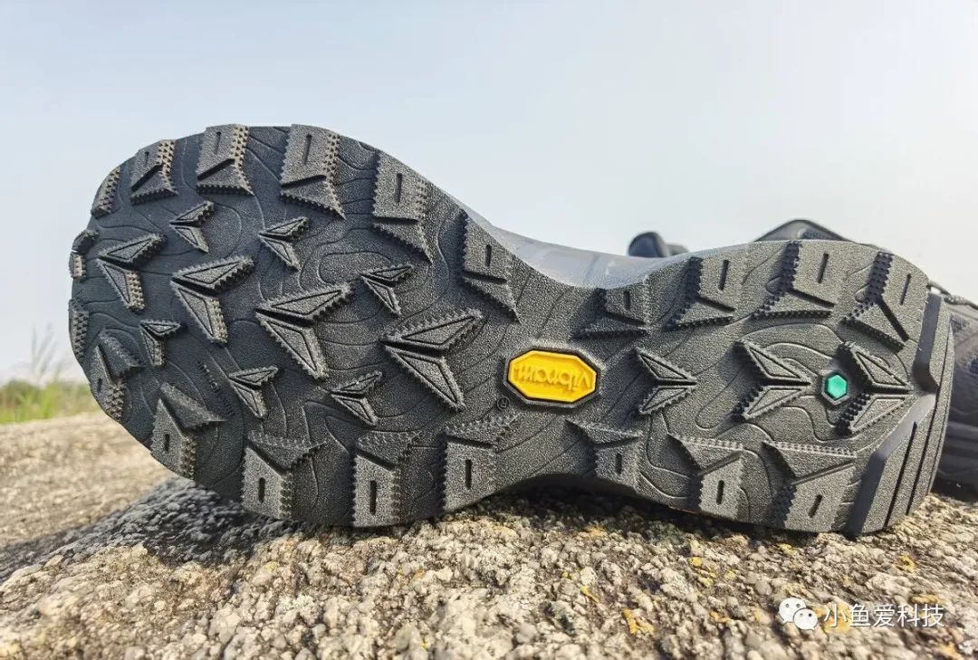 而作为登山使用,它的鞋底采用的是VIBRAM TRACTION LUG鲨齿技术,据说它能够提升50%的的地面接触面积,以及25%的牵引力,可以看到鞋底有着密密麻麻的花纹,对于山上崎岖的路面,它就如同一辆越野车自由驰骋。