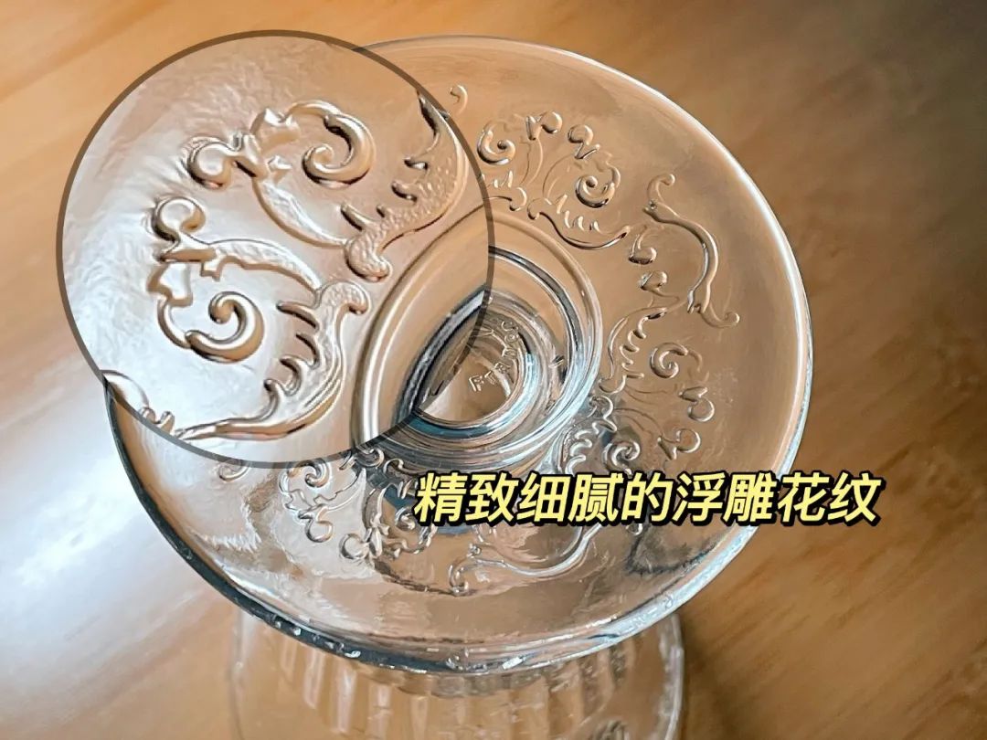 古典风浮雕精致大方,很符合当下大家对复古风格的审美。做工扎实,玻璃虽厚但晶莹剔透,非常有质感。