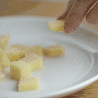 第三步,用奶酪刀切成小方块,或用奶酪铲,铲成不规则的小块。