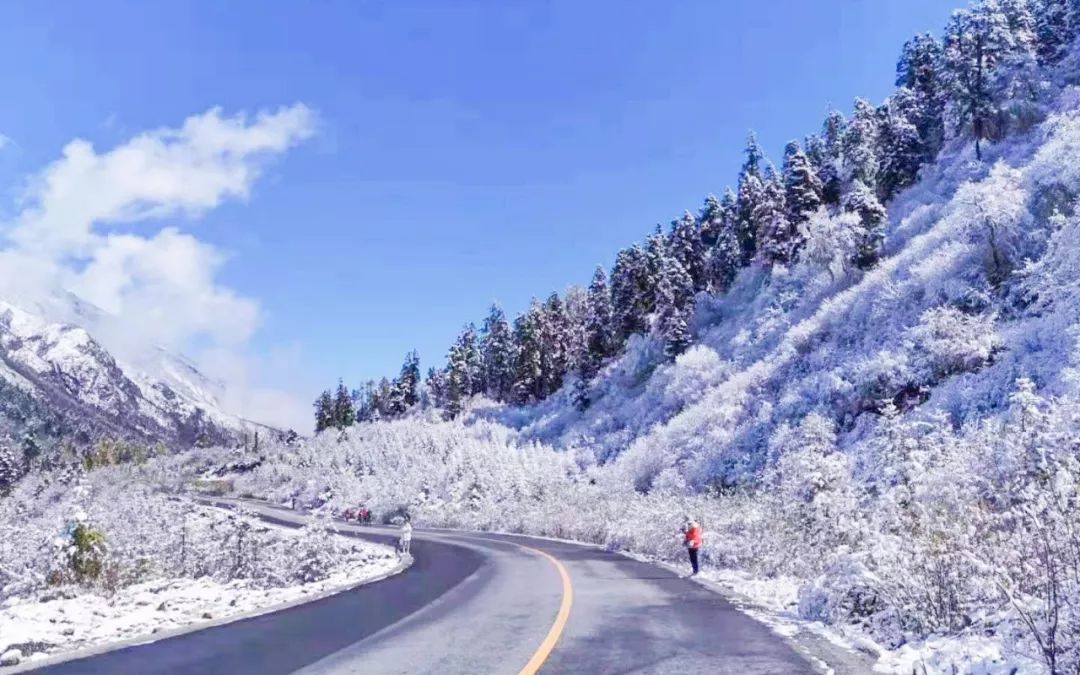 沿着盘山公路一路前往毕棚沟,路上建议大家千万别睡。在快到理县的时候,一路尽是雪山与松林,超美!绿葱葱的松树挂满了白茫茫的雪花,山上还有一群群牦牛在吃草,这里纯粹得像是世外桃源。
