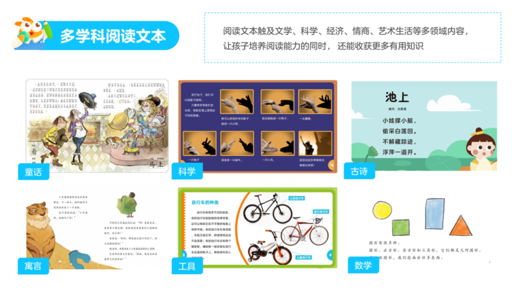 全科阅读,也就是说覆盖了童话、寓言、科学、古诗、数学等等