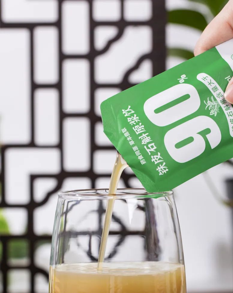 而经过专利萃取,这款铁皮石斛原浆,一袋≈200g石斛鲜条,滴滴如金!铁皮石斛含量>90%,吸收率高于99%!喝进去的每一口都是精华!
