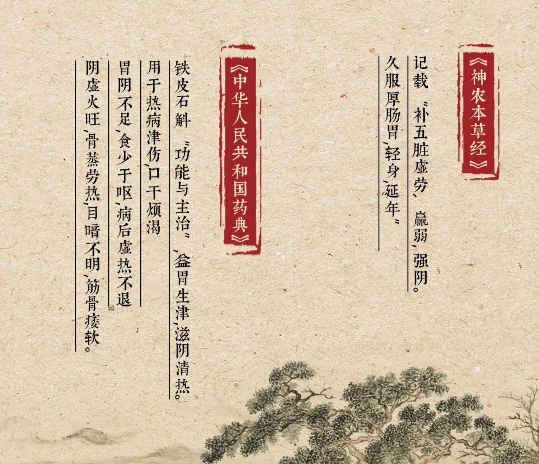 《神农本草经》称石斛补五脏虚劳,羸弱,强阴。滋养身体。