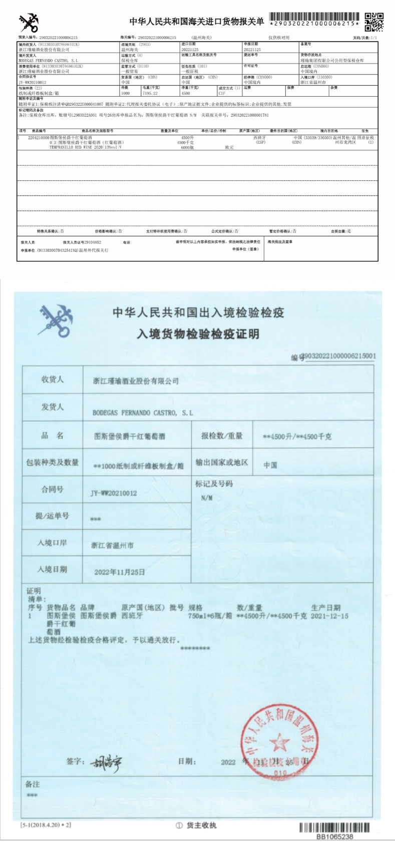 海关检测签发的官方卫生证和报关单