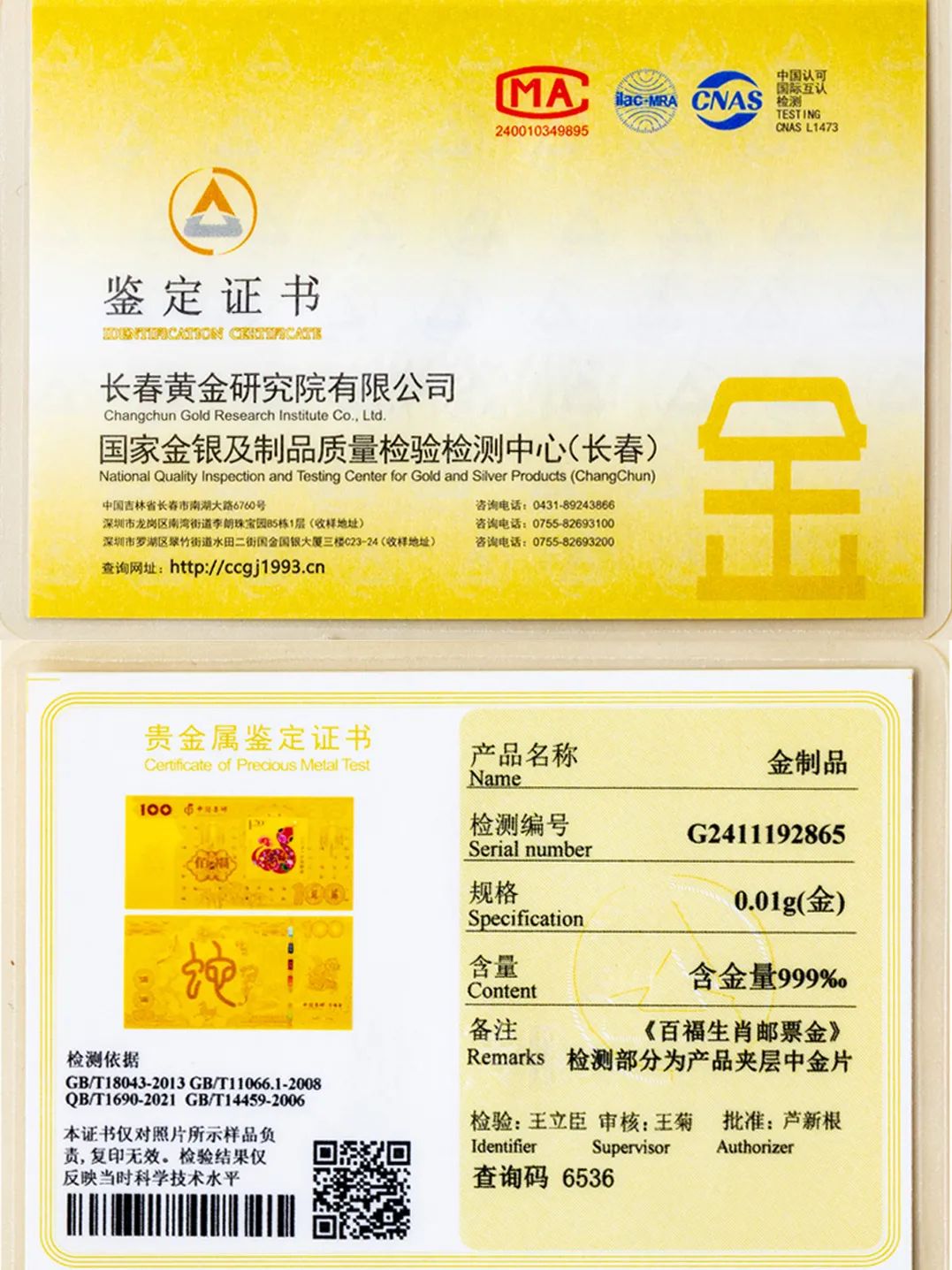 中国集邮为每一枚金钞都配套搭载了产品证书和贵金属鉴定证书,双证在手,恃才矜贵!