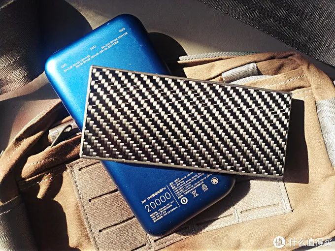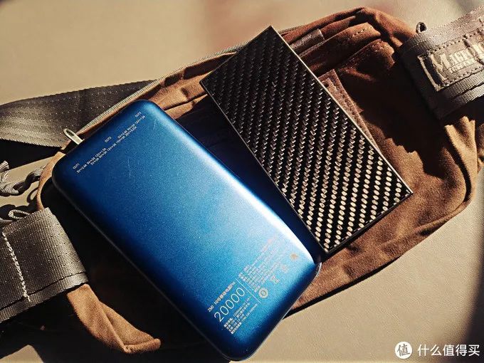 我把手里的两个2万容量的移动电源作了对比下。左侧蓝色的一个,右侧就是NB的NB20000。在外壳上NB20000没有像左边这款产品一样用铝合金的材质,而是采用碳纤维复合材料制造。