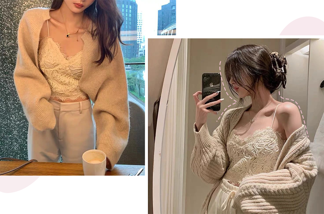 纯净白色的法式蕾丝内衣温柔包裹着身体,搭上一件暖融融的宽松毛衣,细腻柔软地撩人,毫无攻击性的性感,绝对是纯欲风穿搭