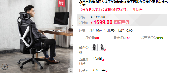 现在这把永艺“蒙柯”人体工程椅,不带搁脚款原价1499元,搁脚款原价1699元。