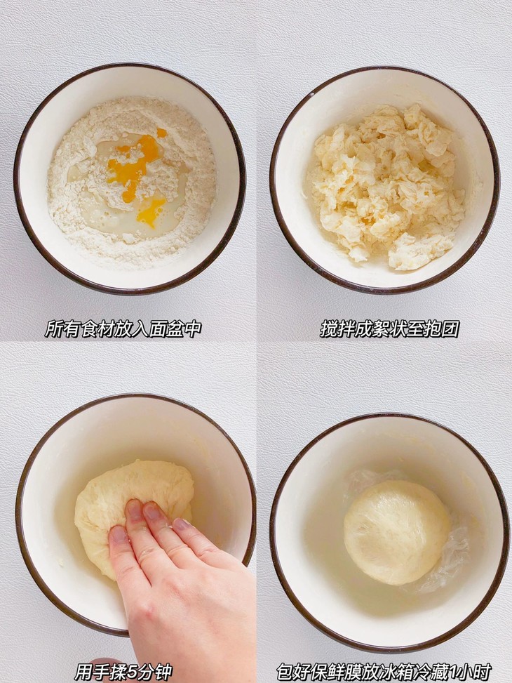 ❶所有食材放入面盆中,搅拌成絮状至抱团,再手揉5分钟揉至光滑面团,包好保鲜膜放冰箱冷藏1小时