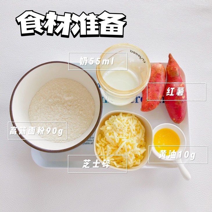 ❷面团冷藏期间,红薯去皮切块蒸熟,趁热压成泥
