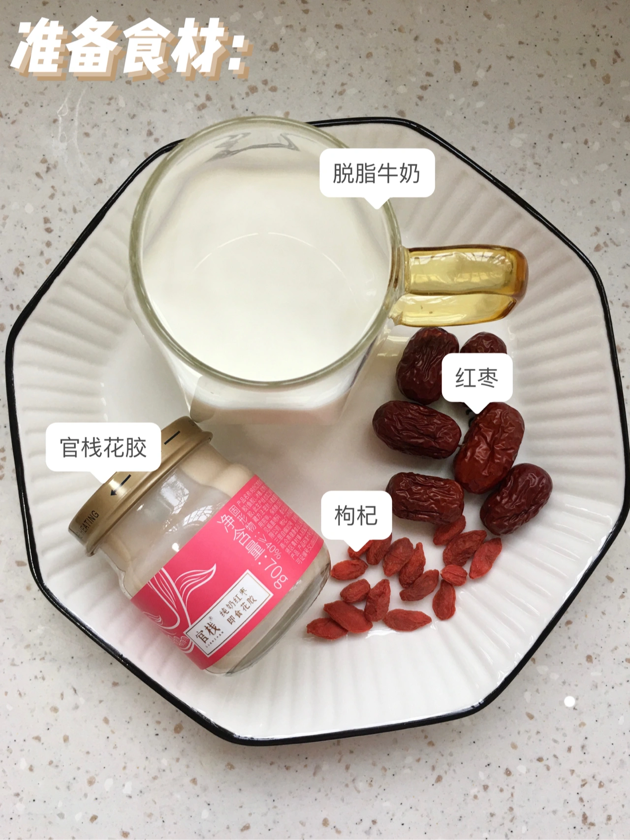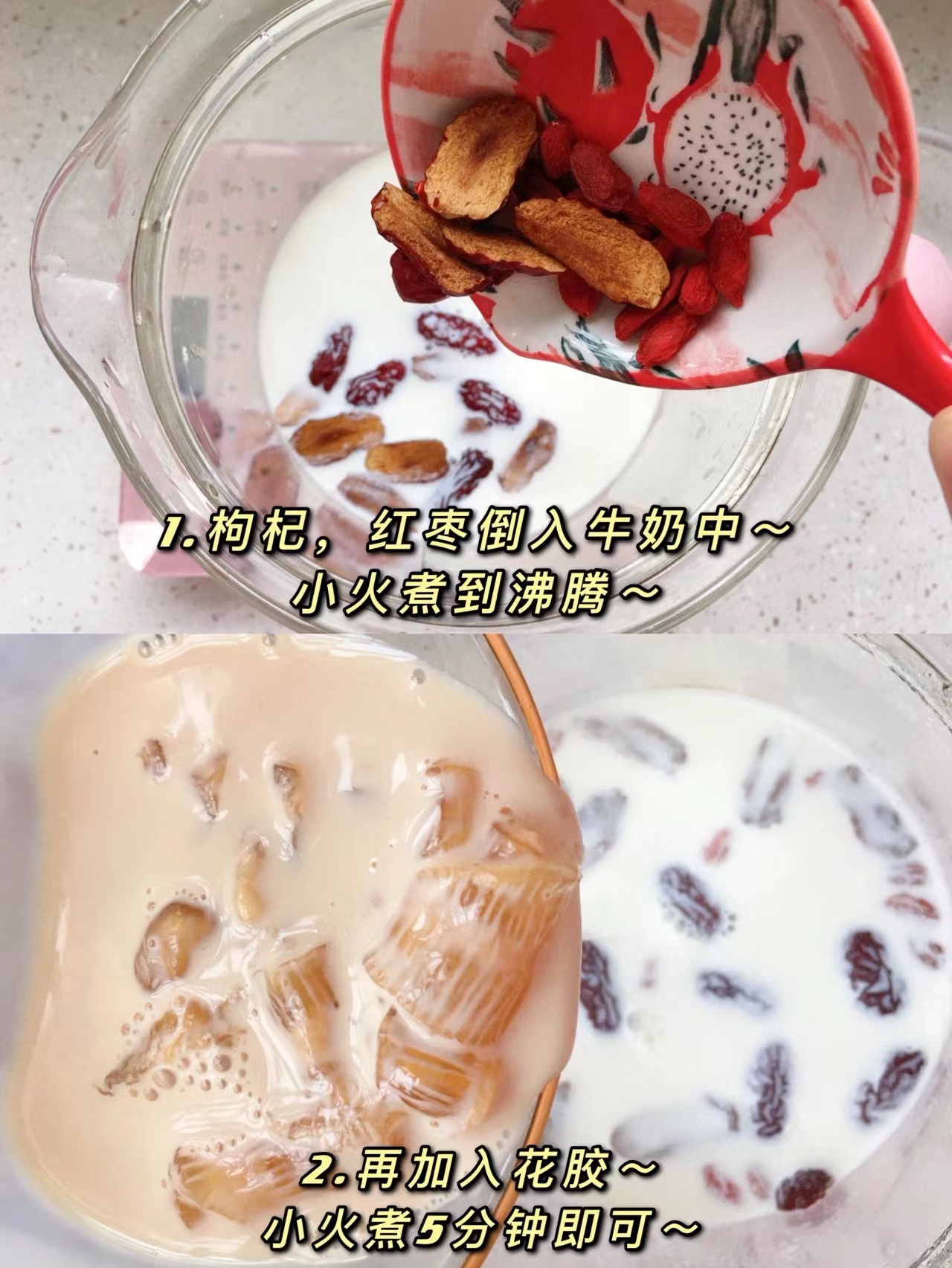 ✅食材:红枣5-6颗,枸杞适量,花胶一罐,牛奶150毫升~