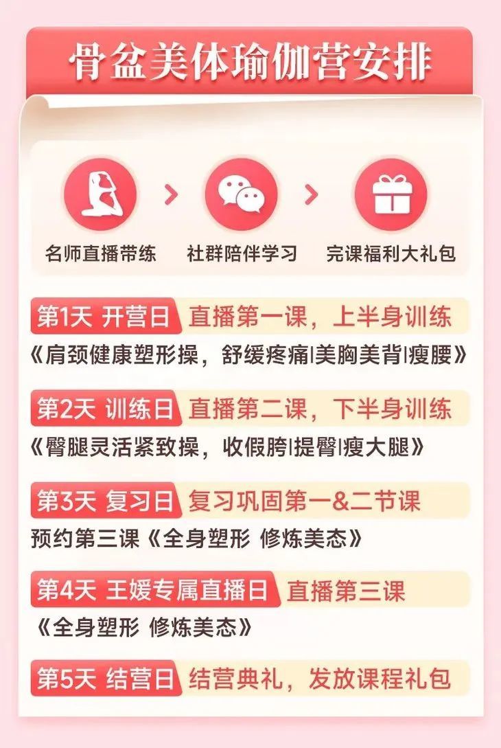 王媛就告诉大家:骨盆瑜伽是女性的福音,是自己切身体会骨盆瑜伽的好处,才决定让更多被身材、体态、健康困扰的人知道它并且一起练起来。为了让学员在线上教学课,也能更快更好地掌握骨盆瑜伽,王媛做了非常多的努力:王媛平常的瑜伽指导费用高达5000+/小时,而且她之前从未开设过直播课。这次她决定亲自出镜直播带练,这可谓是难得一遇的好机会!贴心的瑜伽指导老师,一对一为你提供帮助,帮你及时解答练习过程中的问题。还会搭建友爱社群,督促和鼓励大家一起坚持和努力,再也不怕半途而废了。
