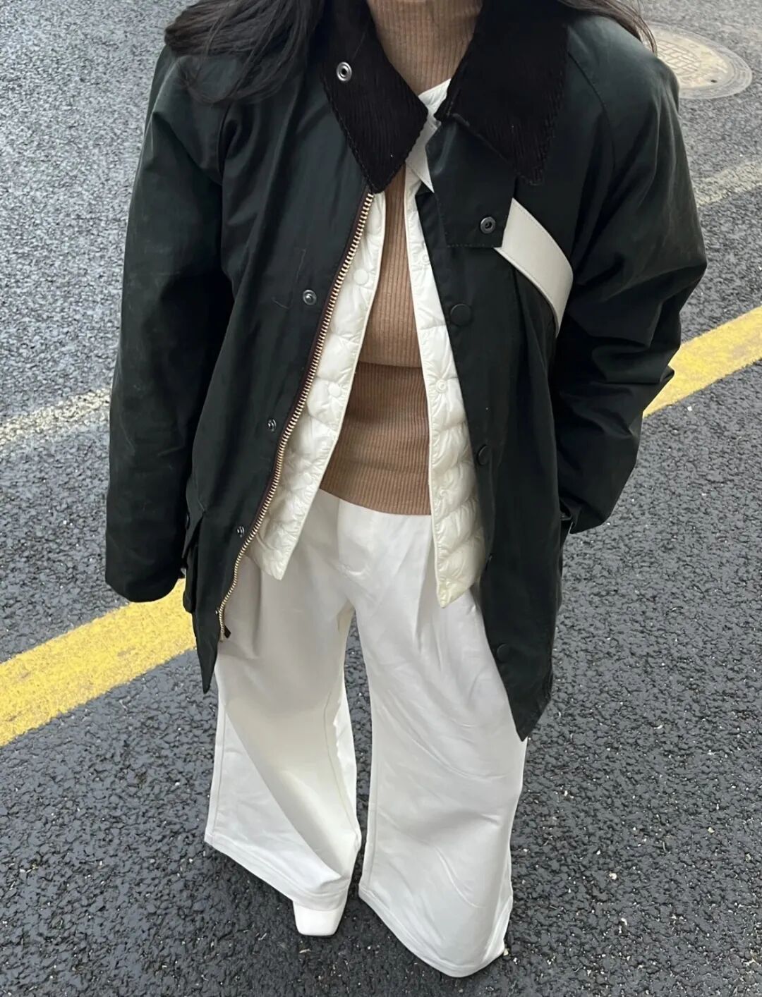 衣身采用横条绗缝,视觉上削弱羽绒所带来的厚实感内里走线工整。