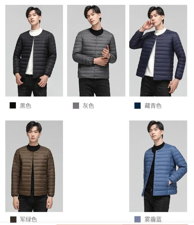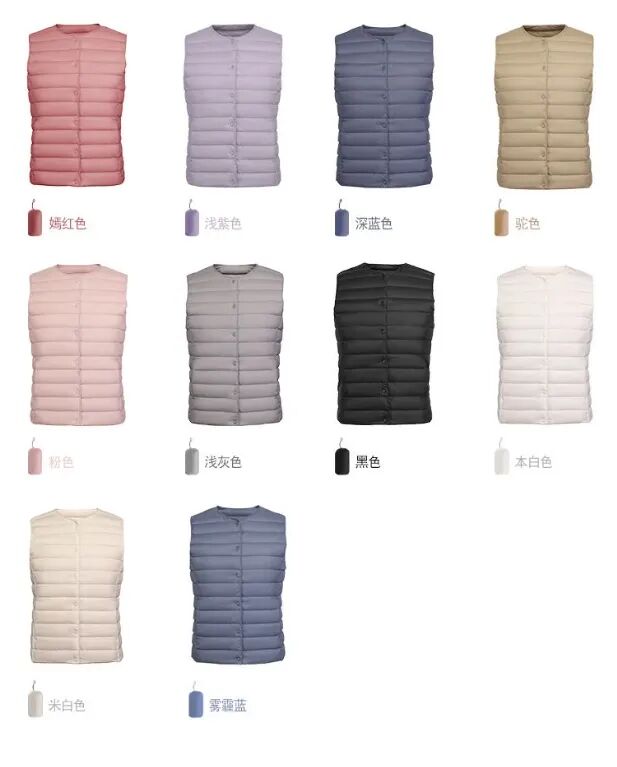 共35个颜色:女款羽绒服-15色;女款羽绒马甲-11色;男款羽绒服-5色;男款羽绒马甲-4色